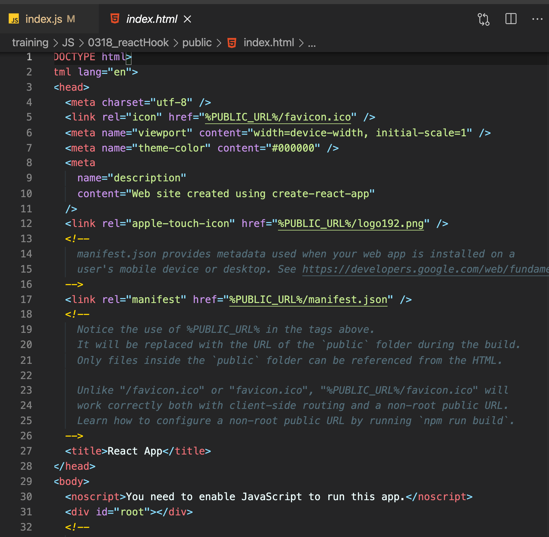 ๊ทธ์ธ ๊ธฐ๋ณธ ํ์ผ๋ค index.js, index.html, App.js, App.css ์์๋ ํ์ ์๋ ๋ถ๋ถ๋ค์ ์ง์์ค๋ค.