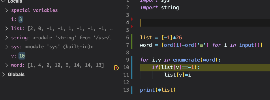 ๊ฐ๊ฐ์ ์ํ๋ฒณ์ ๋ํด์, a๊ฐ ์ฒ์ ๋ฑ์ฅํ๋ ์์น, b๊ฐ ์ฒ์ ๋ฑ์ฅํ๋ ์์น, ... z๊ฐ ์ฒ์ ๋ฑ์ฅํ๋ ์์น๋ฅผ ๊ณต๋ฐฑ์ผ๋ก ๊ตฌ๋ถํด์ ์ถ๋ ฅํ๋ค. ๋ง์ฝ, ์ด๋ค ์ํ๋ฒณ์ด ๋จ์ด์ ํฌํจ๋์ด ์์ง ์๋ค๋ฉด -1์ ์ถ