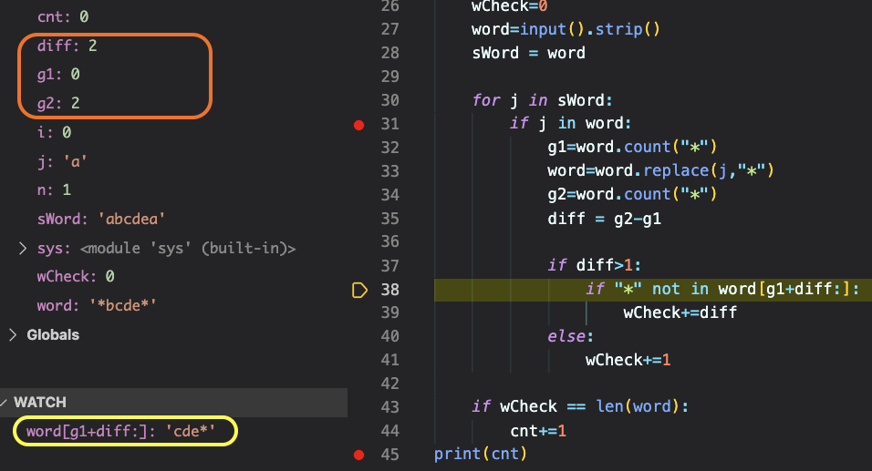 5) ์ฐ์๊ฐ ํน์ ๋จ์ผ๊ฐ์ ์ฒดํฌํ ๊ฐ์์ word์ ๊ฐ์๊ฐ ๊ฐ๋ค๋ฉด cnt+1