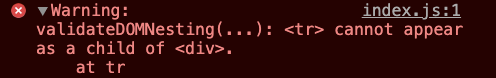 validateDOMNesting(...): <tr> cannot appear as a child of <div>