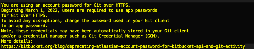 You are using an account password for Git over HTTPS. remote: Beginning March 1, 2022, users are required to use app passwords remote: for Git over HTTPS. remote: To avoid any disruptions, change the password used in your Git client remote: to an app password. remote: Note, these credentials may have been automatically stored in your Git client remote: and/or a credential manager such as Git Credential Manager (GCM). remote: More details: remote: https://bitbucket.org/blog/deprecating-atlassian-account-password-for-bitbucket-api-and-git-activity