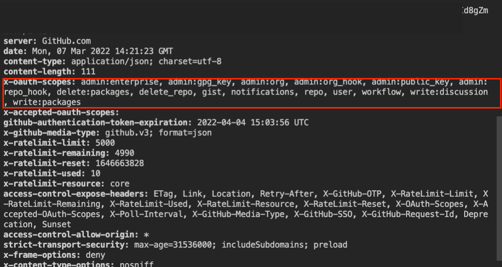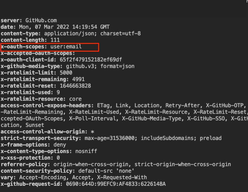 curl -H "Authorization: token 본인의토큰" https://api.github.com/user/유저이름 -I