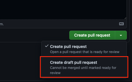 PR 생성 시 Create draft pull request 를 누르면 , PR 생성이 되어도 merge는 활성화되지 않고,