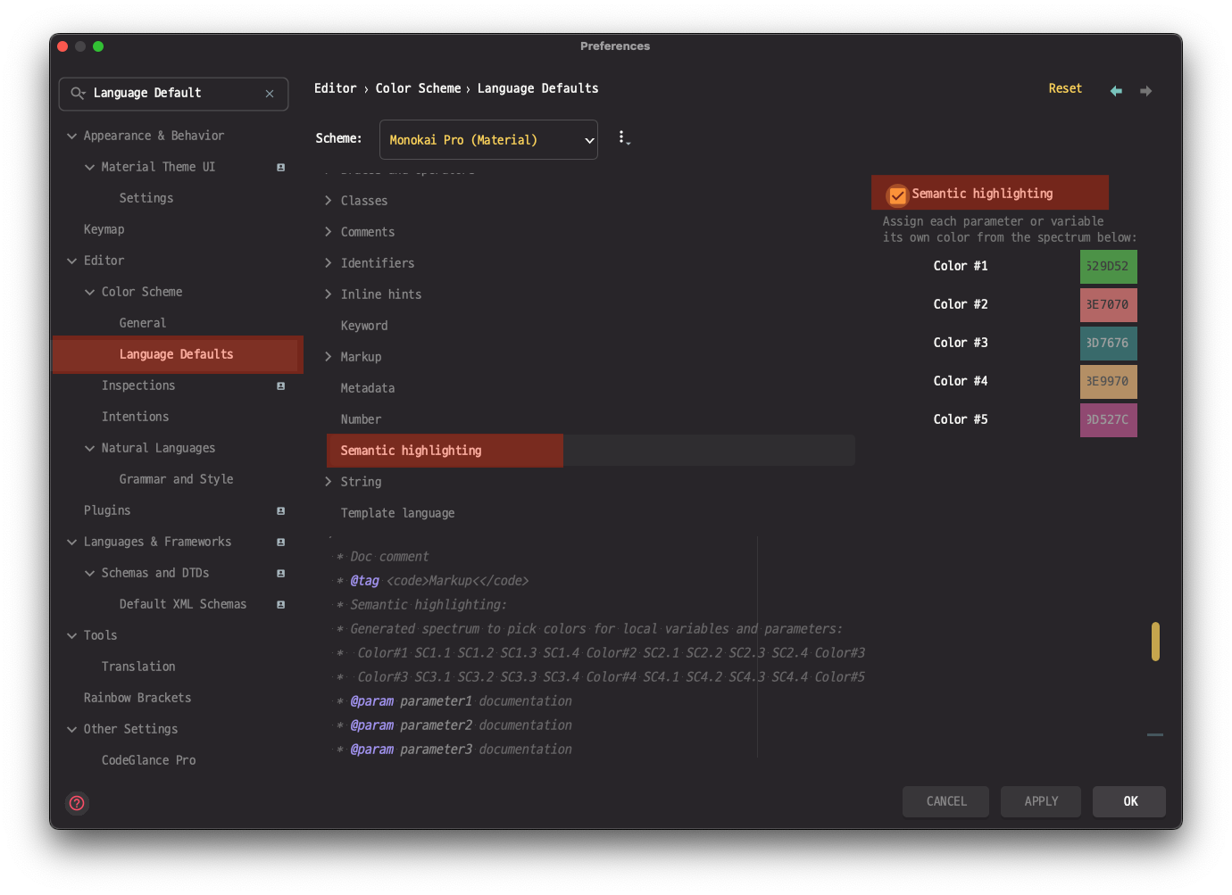 설정 방법: Preference(⌘+,) > Editor > Color Scheme > Language Defaults > Semantic highlighting