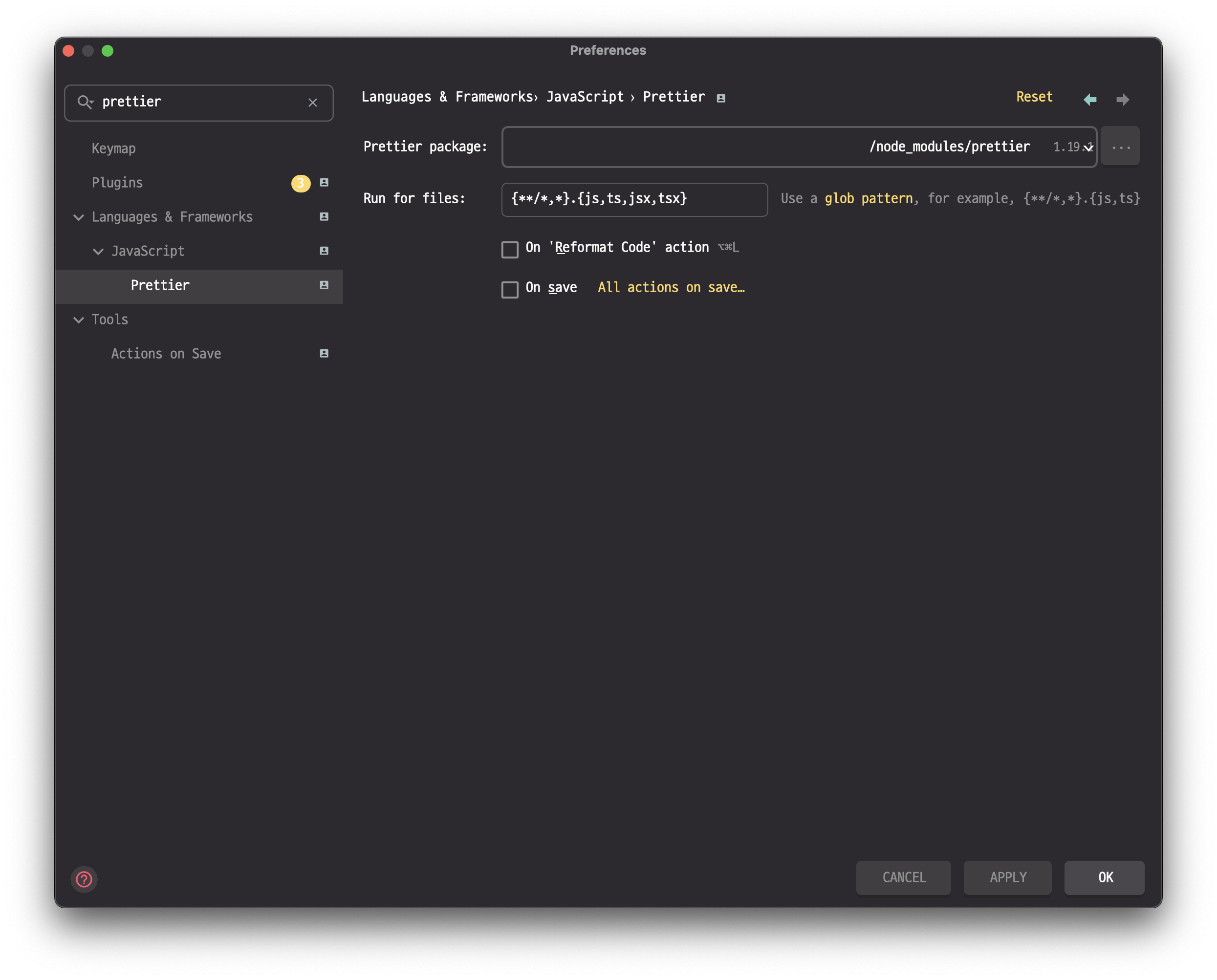 - Preference(⌘+,) > Languages & Frameworks > JavaScript > Prettier로 이동합니다.