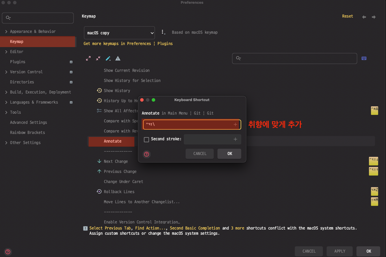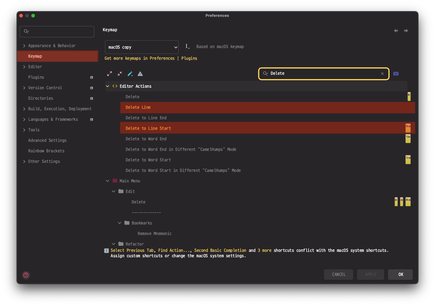 설정 경로: Keymap > Delete 검색 > Delete Line 단축키 제거 (Remove ⌘ ⌫) Delete to Line Start 항목에 원하는 단축키를 추가합니다. (예: ⌘ ⌫)