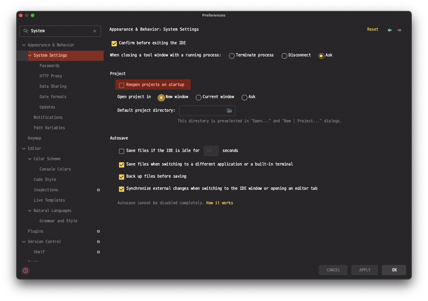 WebStorm 시작 시 최근 프로젝트가 아닌 메인 메뉴로 가게 설정하기