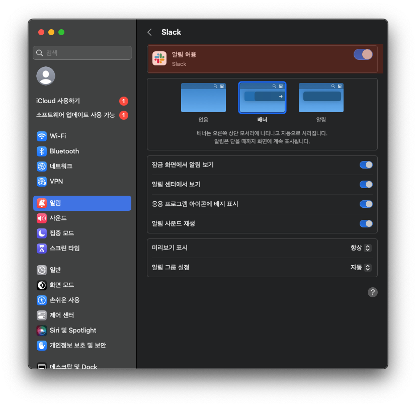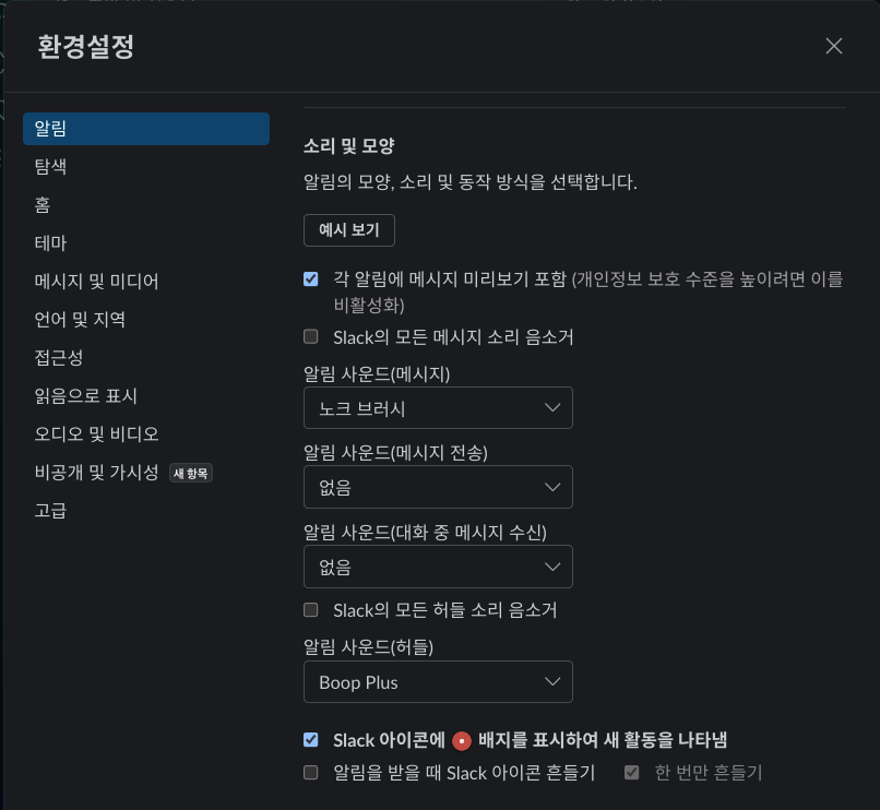 맥북에서 슬랙 알림 미리보기 혹은 소리가 나지 않을 때 아래 보기들을 확인해보자.