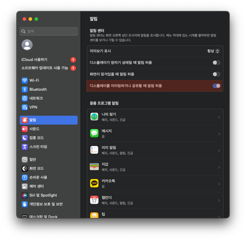 Mac 시스템 환경설정의 알림 센터 설정을 확인해야 한다.