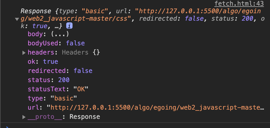 fetch๋ฅผ ํตํด ์์ฒญํ์ ๋ ์น์๋ฒ๊ฐ ์๋ตํ ๊ฒฐ๊ณผ๋ฅผ ๋ด๊ณ ์๋ ๊ฐ์ฒด