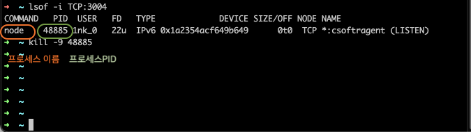 // lsof -i TCP:{오류난port번호}